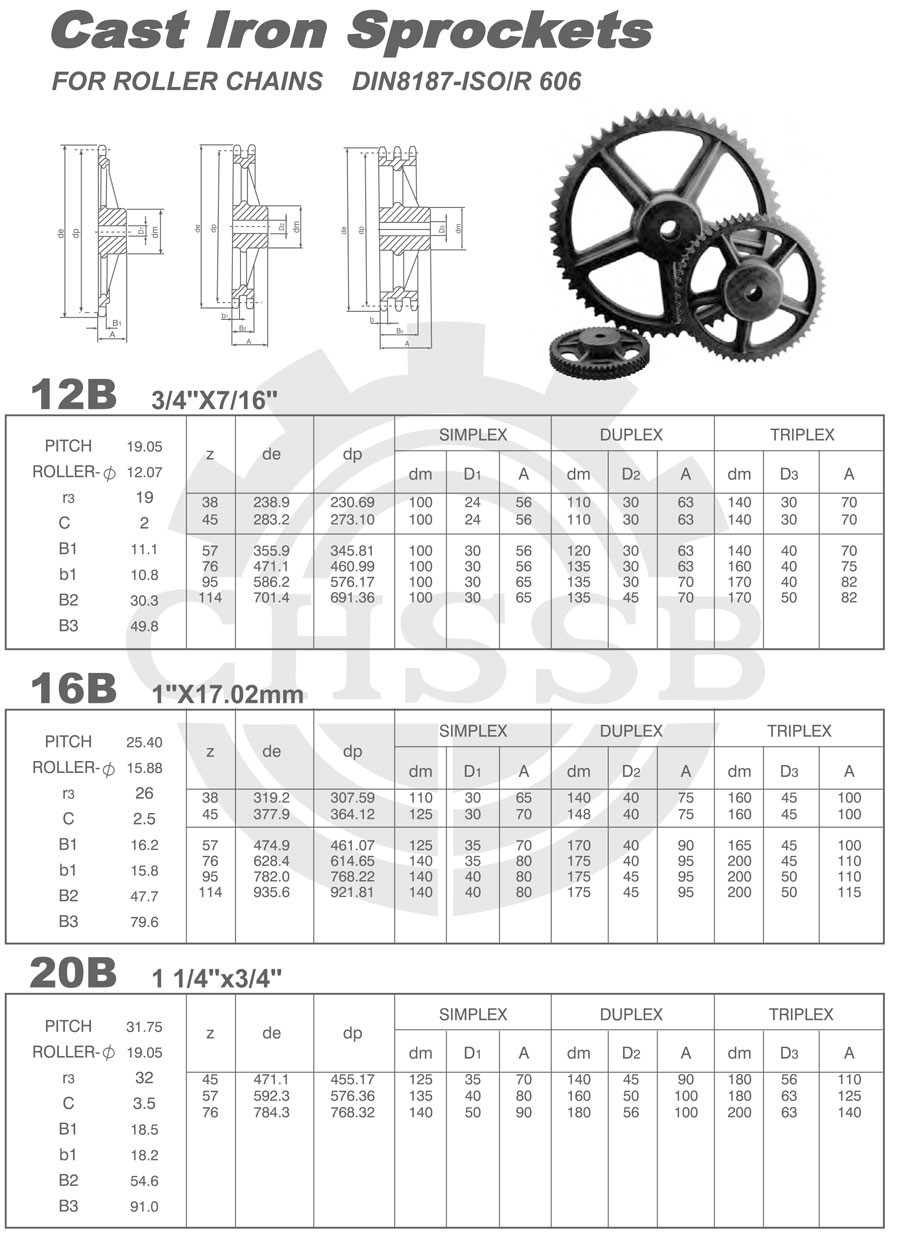 B-臺式鏈輪;S-Single單排,D-Double雙排,T-Triple三排;Pitch節(jié)距;歐標用毫米(Metric,mm),美標用